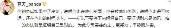 葛天今天上午更新微博:“你的身後如果中了冷箭,說明你走在他們前面;你會被他們傷到,說明你走得不夠遠,還在他們的射程以內。——所以不要停下來解釋自己,要證明別人是偏見,唯壹的辦法就是證明自己是對的。為此你需要往前走,更努力,平靜而從容。”- 新聞來源於其它媒體,內容不代表本站立場!