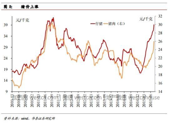 事實上,自今年年初以來,被壓抑了多年的豬價就開始飛快上漲。銀河證券指出,自3月18日全國生豬市場的拐點出現,我國已進入新壹輪豬周期的周期性上漲期後,豬價已連續上漲了近4個月,全國瘦肉型豬出欄均價已經從拐點位置的11.6元/公斤左右漲至當前的17.3 元/公斤左右,已累計上漲了5.7 元/公斤,漲幅為49.1%,已近50%。