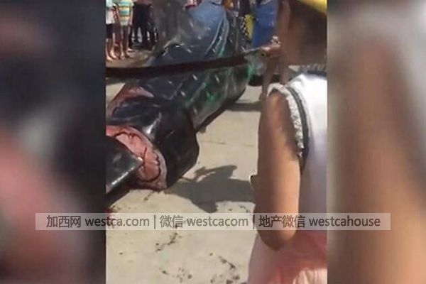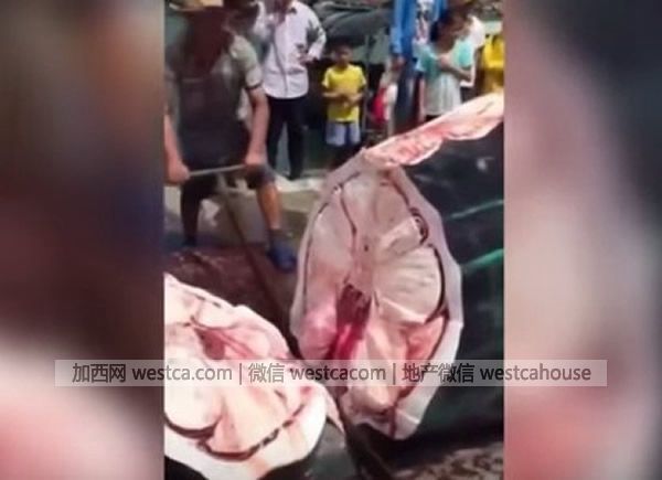 近日網絡瘋傳壹段活鯨鯊被殘忍活宰的影片,影片中2名男子拿著大鋸子,將它的身體壹片片鋸下,大量血水噴發,畫面怵目驚心。該影片放上網後,引發網友熱議,有外國媒體報導,拍攝地點在廣東省陽江市,網友表示該畫面讓人感到震驚與心疼。從影片中可見,2名男子以長鋸將鯨鯊的身體壹片片切下,圍觀群眾驚叫,還有圍觀者上前開心自拍。而鯨鯊尚有意識,隨著魚身被切下,其嘴巴仍不停開合,身體還爆出大量血水,整個過程相當血腥。