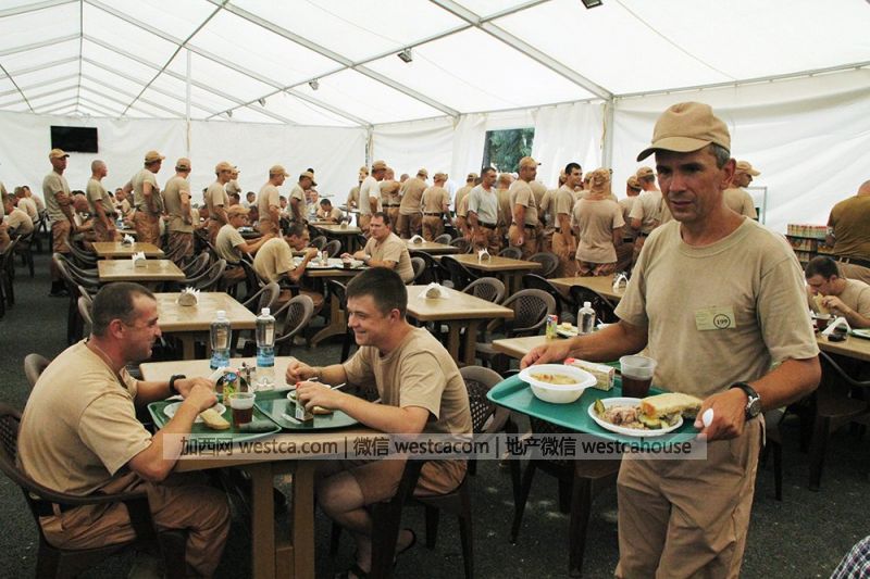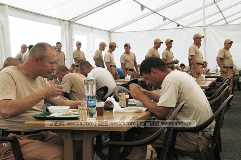 俄罗斯媒体10月2日首度曝光驻叙利亚“赫梅明”军事基地的俄军营地照片。从照片中可以看出,营地生活设施齐全,营区内设有帐篷餐厅、面包房、装有空调的板房宿舍,甚至还有桑拿房和熨衣房。“赫梅明”军事基地是执行打击IS作战任务俄军部队的驻扎地。自9月30日起,俄军机从该基地起飞,已对IS阵地实施了数轮空袭行动。(宁远)图为官兵就餐的帐蓬餐厅。