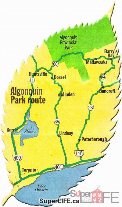 回途如果取道Hwy 35,則可以順路在 Dorset、Minden 及Haliburton幾處停留;如果沿 Hwy 60繼續往前駛,則在經過Madawaska Valley 後轉南走Hwy.62,可順道欣賞壹下 Bancroft與Peterborough 兩地的秋葉。全部行程約480公裡。可致電 705-633-5572,或瀏覽網站:www.algonquinpark.on.ca。