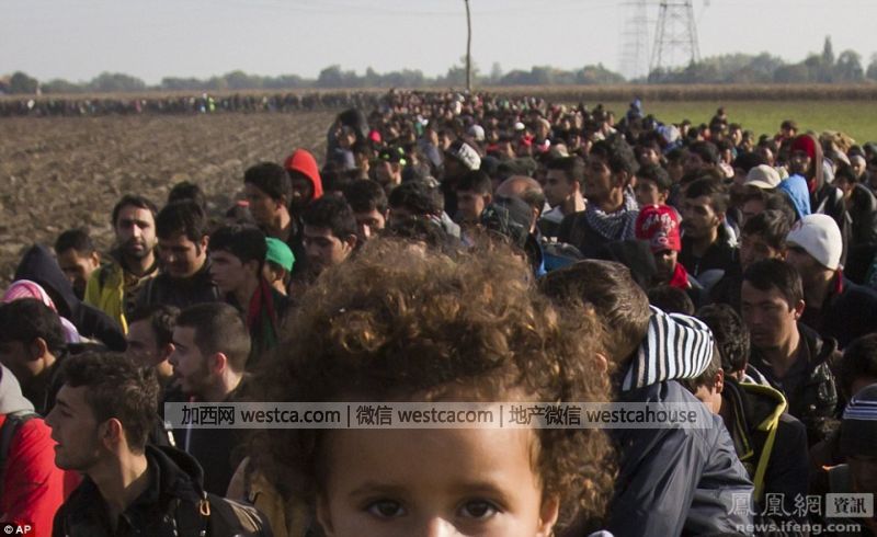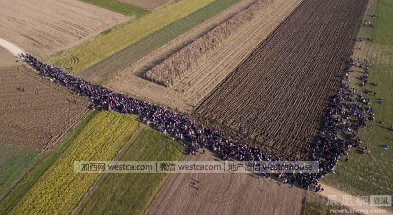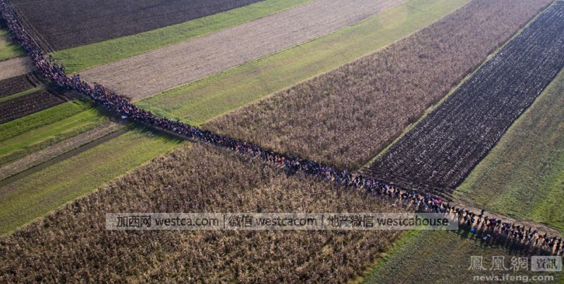 在最後壹批數百名難民獲准通過邊境進入匈牙利後,匈方已在邊境沿線豎起圍欄,以防止難民在未經許可的情況下越界。此後,大批難民被迫改道,另外壹個地處巴爾幹半島難民通道的東歐國家斯洛文尼亞瞬間成為難民進入西歐的主要通道。圖為穿越田野的巨大難民隊伍。