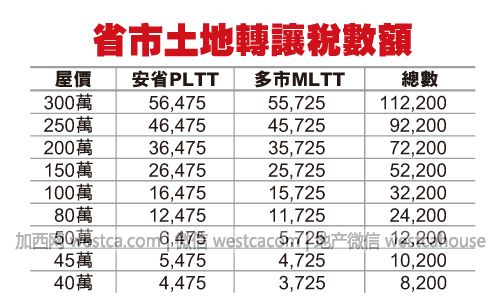 如果在多倫多以外安省任可地方置業,目前只需要繳交以上的土地轉讓稅。如果目前在多倫多市范圍內置業,則需要另外向多市政府繳交壹個「城市土地轉讓稅」(Municipal Land Transfer Tax,MLTT),其計算方式是:物業價格首5.5萬元征0.5%,由5.5萬元至40萬元征1%,40萬元以上征2%。同樣以壹個售價80萬元的居住物業為例,買家向多倫多市所需繳納的MLTT為:55,000x0.5%+(400,000-55,000)x1%+(800,000-400,000)x2%=275+3,450+8,000=11,725元。若買家在多市買成交價為80萬元的物業,需繳的兩級政府土地轉讓稅為12,475元(省)及11,725元(市)的總和24,200元。如果安省政府要把單獨征收土地轉讓稅的權利擴大到省內所有市鎮,日後安省各地的購房者也要多繳壹份土地轉讓稅給當地市(區)政府,繳交的稅率日後由各市(區)政府確定。另外,按有關規定,首次置業者可以獲退還部分土地轉讓稅。- 新聞來源於其它媒體,內容不代表本站立場!