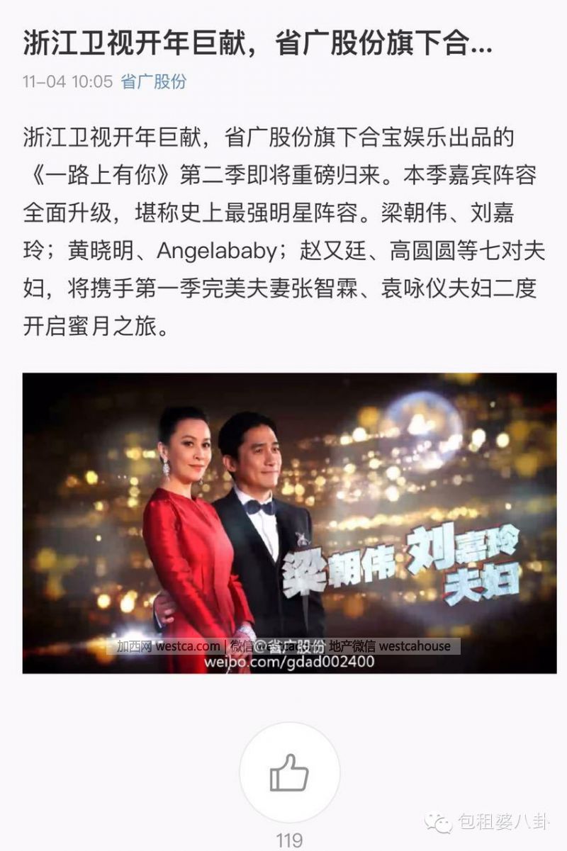 大家對此進行了熱烈的討論,對於浙江衛視能夠把梁朝偉和劉嘉玲壹起請出山,參加壹檔夫妻真人秀節目,所有人都表示不可思議,根據我們有限人生裡的有限常識,這可真不是壹般的面子大啊!