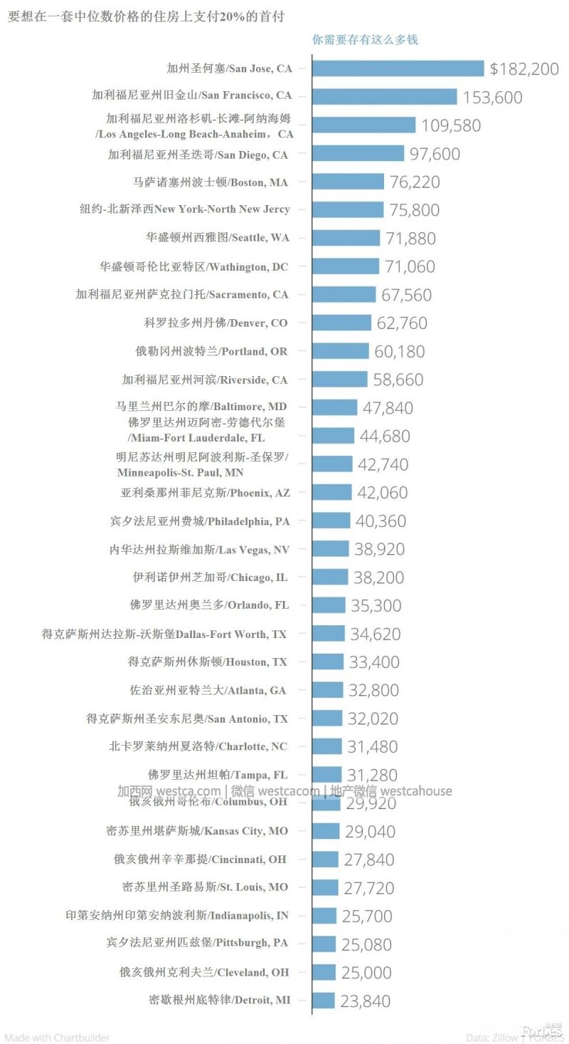 那麼,美國各大城市在這方面的排名情況如何呢?下面就是在這些都市地區購買中位數價格的住房時需要存夠的首付款: