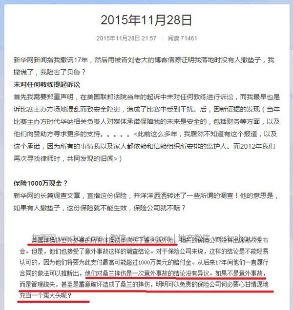 11月27日上午,新華網刊發《“撤墊子”指控沒有依據——桑蘭摔傷真相調查》的報道指出,桑蘭持續拾多年,壹直指控羅馬尼亞體操隊的教練Octavian Belu(奧克塔萬·貝魯)在她起跳之前的瞬間去撤墊子,新的證據顯示,桑蘭的指控並沒有根據。貝魯不僅沒有撤墊子,而且還是桑蘭摔傷後第壹個走到她身邊幫助她的人。當日下午,桑蘭曾叁次通過其官方微博作出回應,“有人繼續拿錄像截圖做文章,僅僅憑借幾張截圖就下了結論。你們如此窮追不舍,是何用意?潑髒水也不應該忘記職業精神吧。”