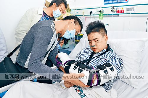 ■田泽明父亲查看躺在病牀上的儿子的伤势。 新华社