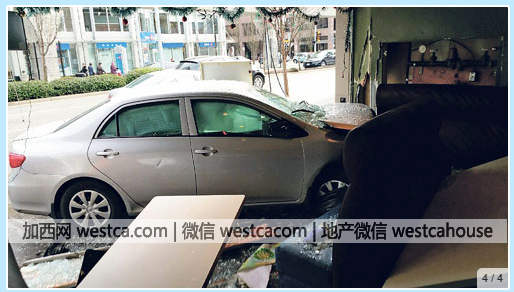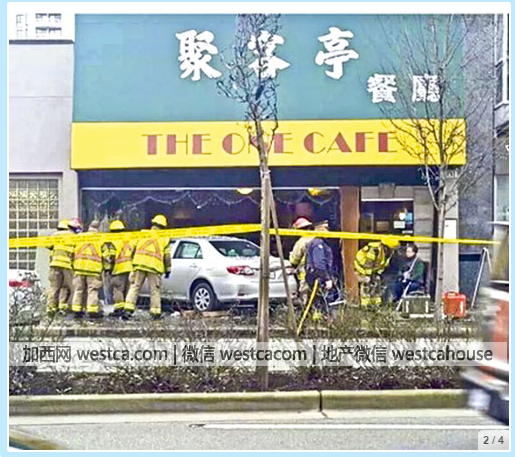 列治文市3號路(No.3 Rd.)近西敏公路(Westminster Hwy.)周叁發生嚴重車禍,壹輛由78歲華裔女長者駕駛的私家車,先後與兩車輕微碰撞後失控,鏟上行人道,再穿過玻璃大門沖入中餐館。事件中女司機及兩個路人受傷,送院治理情況穩定,無性命危險,中餐館裡面無人受傷。