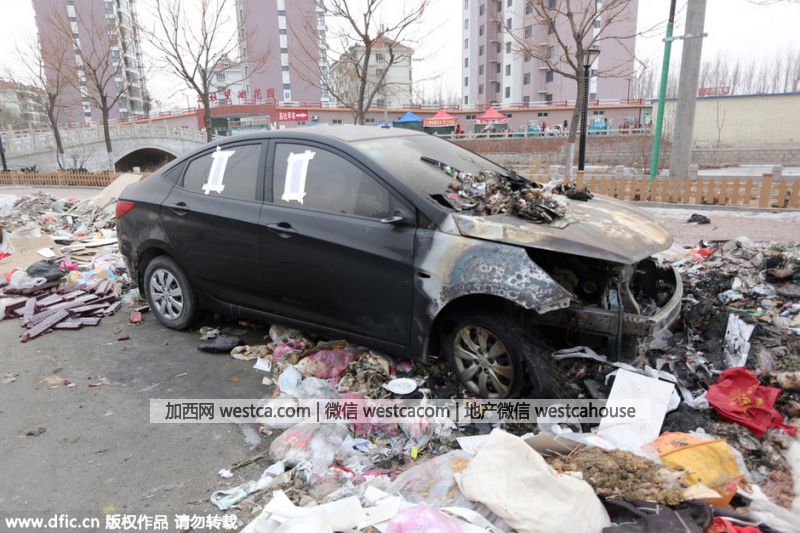 這片垃圾帶裡還停放著壹台看上去還挺新的現代牌黑色小轎車,車玻璃上被人貼上了“事故車勿動”的字條,車前部有明顯焚燒過的痕跡,車胎露出鋼絲,前部燒毀,前部玻璃也出現破損,引擎蓋上堆了壹些垃圾。圖為現場。