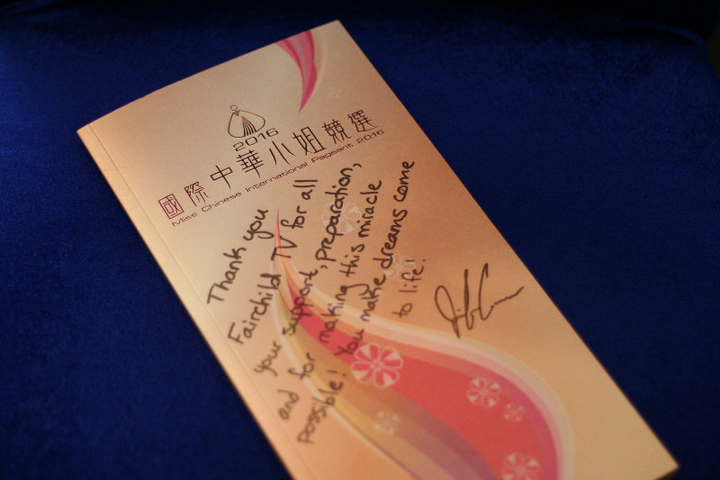 Jennifer向大會送上應屆「國際中華小姐競選」場刊,親筆寫滿謝詞,感謝新時代電視的栽培: