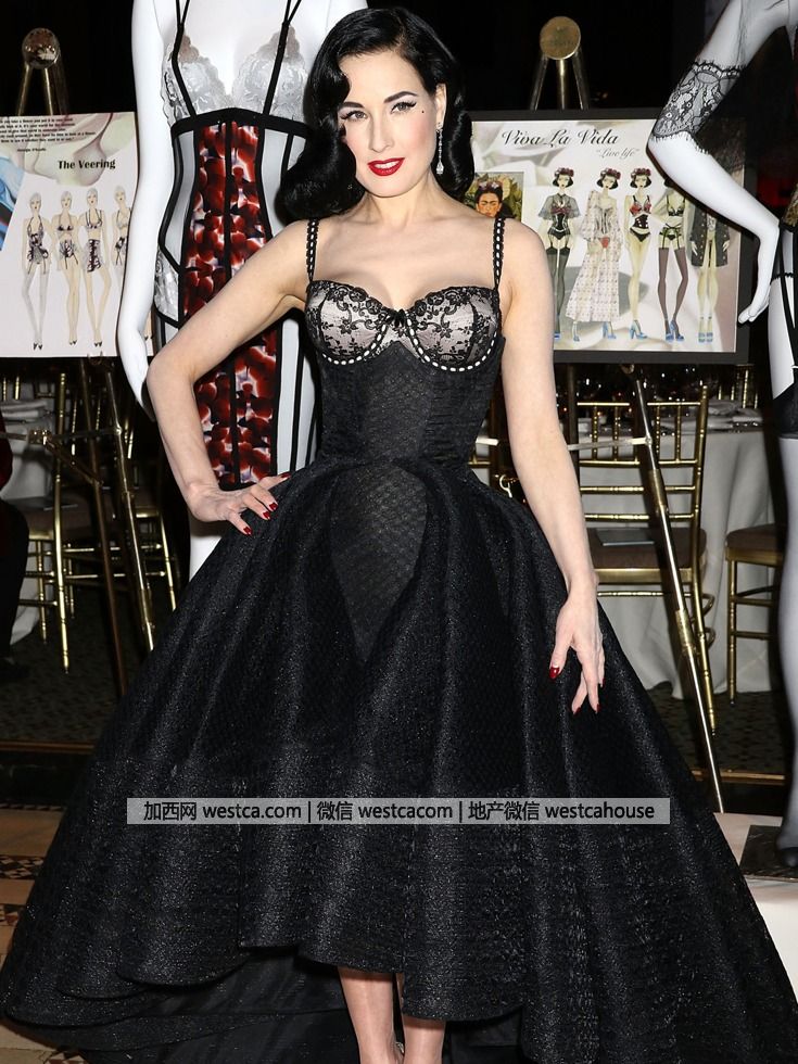 脫衣舞娘蒂塔·萬提斯著黑色蕾絲吊帶禮服,大方露胸。
