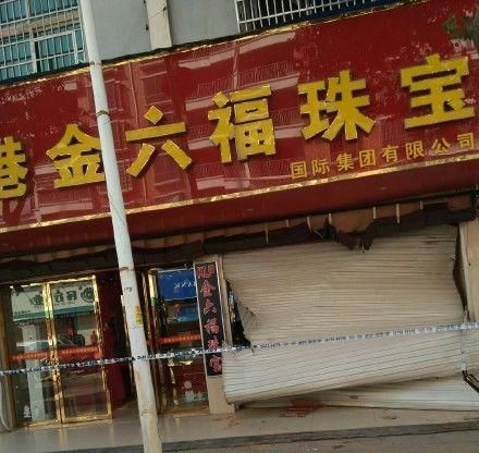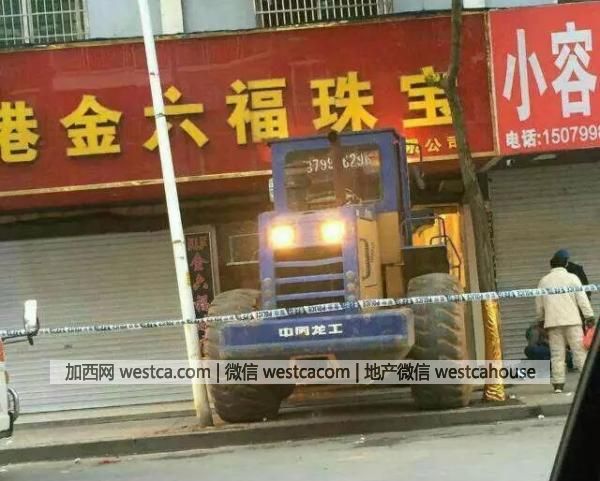 吳偉說,事發縣城中心的康達西路,遭劫的金店名為“香港金六福珠寶”。“凌晨贰叁點鍾,壹個男的開著輛鏟車就沖進金店,卷閘門都捅破了。”吳偉稱,直到6日上午,他路過金店門口時還看到大鏟車停在金店門口,壹半車身已沖進店內。