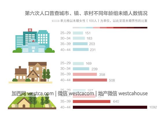 事實上,第六次人口普查數據還顯示,29歲至65歲的人群中,城市男性結婚率始終高於農村;另壹個數字是,同年齡段的城市女性未婚率高於城市男性。