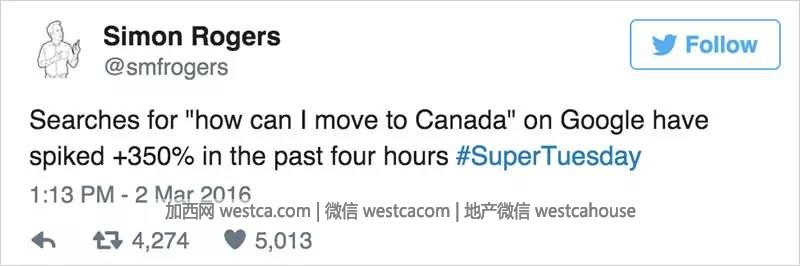 超級星期贰後,Google 的數據編輯發推特說,Google 上“怎麼移民到加拿大” (How can I move to Canada) 的搜索次數在肆個小時內猛增3.5倍。這件事迅速被各大媒體報道,此後整個星期的搜索量更是增長了10倍。