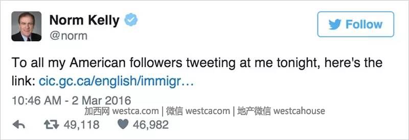 調皮的多倫多市議會議長發了壹條推特,對想移民的美國人民表示歡迎,同時附上了加拿大政府網站上關於移民內容的網頁,這條推特被轉發了近5萬次。