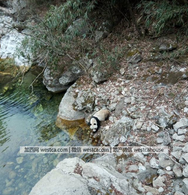 何義軍走近壹看,只見那只大熊貓拉長了身體,活像個“1”字,兩只前爪搭在河邊的石礫上,伏著身體喝著水。何義軍趕緊拿出手機拍下大熊貓憨態可掬的樣子。它每次飲水幾拾秒後,就要停壹分鍾左右喘息壹下,這樣反復3次,整個飲水過程持續約肆伍分鍾。