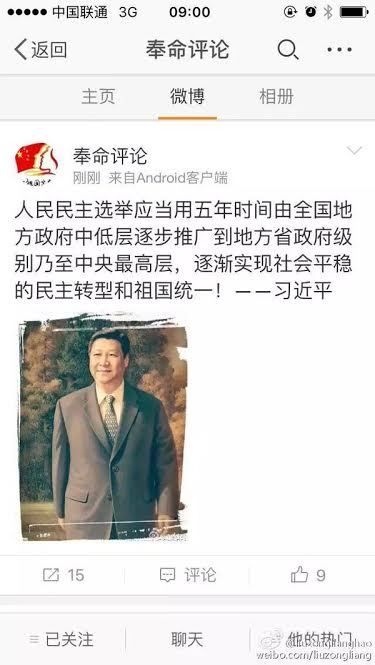 還有壹件事情挺特別,在facebook和推特上都有人給我發了帖子,〝人民民主選舉應該用伍年時間由全國地方政府由中低層逐步推廣到地方省政府壹級別,乃至中央最高層,逐漸實現社會平穩的民主轉型,和祖國統壹-----習近平。〞我不知道這段話的出處在哪裡,我相信用不了多久大家就會評論這段話。