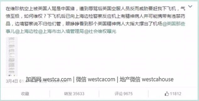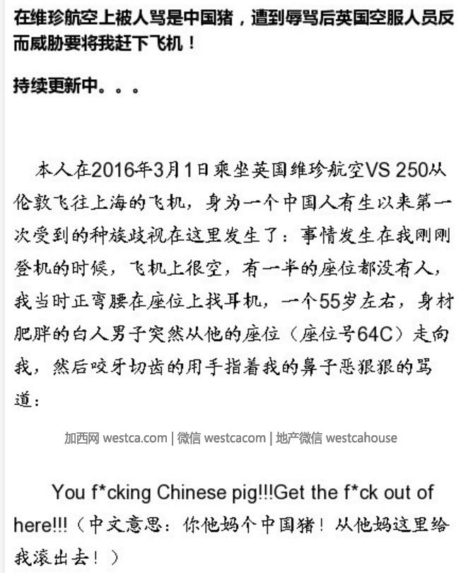 3月LiWei乘坐英國為證航空公司飛機時,無故遭到外籍男子辱罵“中國豬”。