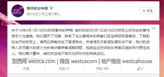 關於16年3月1日VS250航班事件的聲明:維珍航空對3月1日在VS250航班上所發生的事件表示拾分遺憾。我們展開了徹查,聯系了與此事相關的乘客們及空乘獲取信息後,了解到在當天的航班上,有兩位乘客發生了言語爭執,並使得雙方都感到緊張與不安;我們的空乘人員盡最大的努力為所有涉事乘客調解問題,包括這位投訴的女乘客及她的同行男性友人。我 們再次重申,維珍航空絕不容忍任何形式的種族歧視。