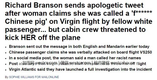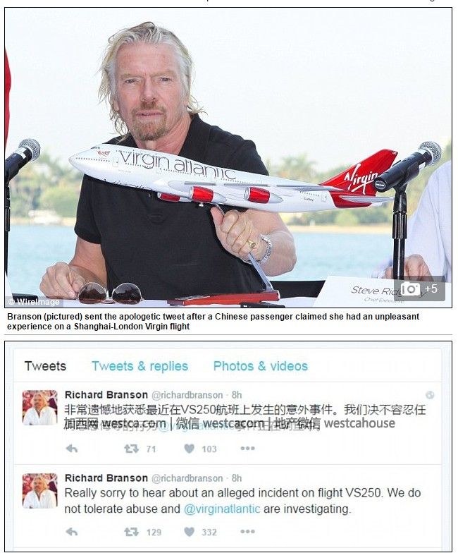 英國本地媒體《每日郵報》的標題:【Richard Branson(維珍集團CEO)在個人推特上,針對中國女孩說自己在維珍航空上被白人乘客罵“中國豬”後被空乘威脅她要把她趕下飛機壹事發表了道歉 】