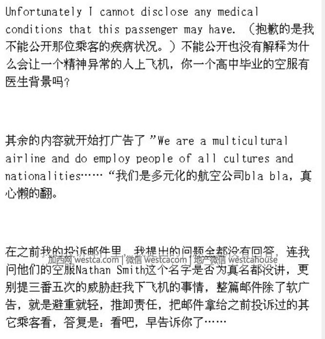 在向空乘Nathan Smith反映情況後,她不僅沒有受到幫助,反而受到空乘Nathan Smith責備,並被威脅繼續吵就下飛機。