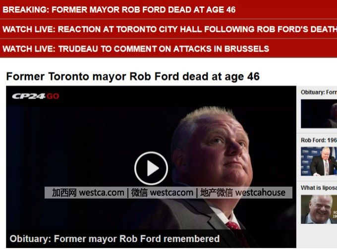 (加西網快訊)安省多倫多前市長福特逝世,終年46歲。他在18個月前證實患癌,被廹退出角逐連任。