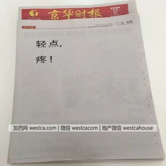 你看明白了嗎?過程簡述是,互聯網家裝新電商平台惠裝找到京華時報投廣告,京華時報“搞錯”了,這兩張圖是要壹起印刷出去的,結果不小心,只印刷了“輕點、疼!”叁個字,這個“大錯”經過24小時的發酵,已經成為壹個大事件。24日早上,京華時報發布了補救措施,幫客戶印刷出後半部分。