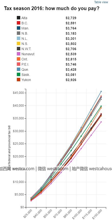 下圖顯示,在2015年6月30日,不同省份和地區的加拿大人,需要繳交多少聯邦和省所得稅。收入水平從25000元到130000元設為8個階段。