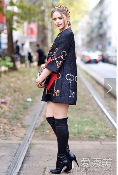 A字版型的黑色連衣裙,充滿質感的提花面料,大大的鑰匙圖案精致個性,整體比較有復古宮廷風的感覺,華麗而高貴,配黑色長靴勾勒美腿線條,增添不少性感氣息。