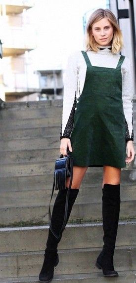 白色高領毛衣領口和袖口加入黑色拼接設計,多了點小個性,搭配墨綠色背帶裙清新又減齡,配黑色長靴瞬間提升摩登范。