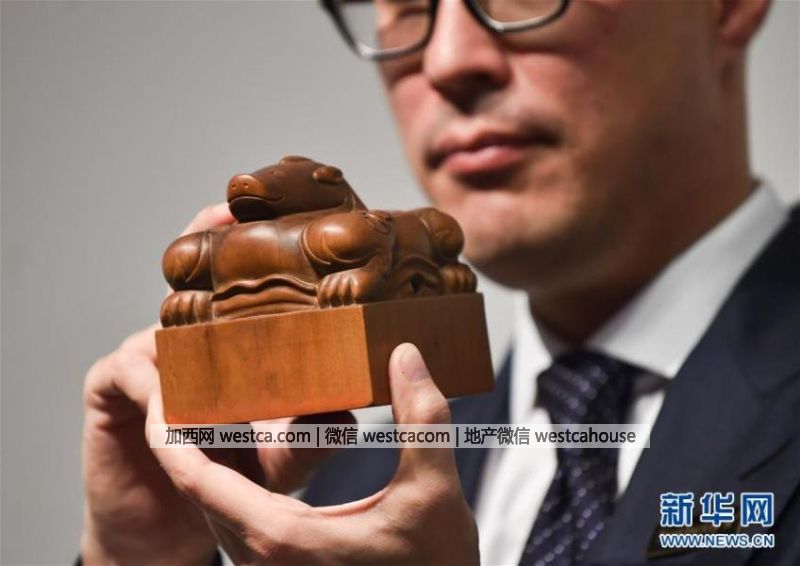 2016年4月6日,香港蘇富比舉行第伍天的春季拍賣。明永樂青花花卉錦紋如意耳扁壺以9700萬港元成交,清康熙“敬天勤民”檀香木璽創康熙印璽拍賣紀錄,以8100萬港元成交。圖為工作人員展示清康熙“敬天勤民”檀香木璽。