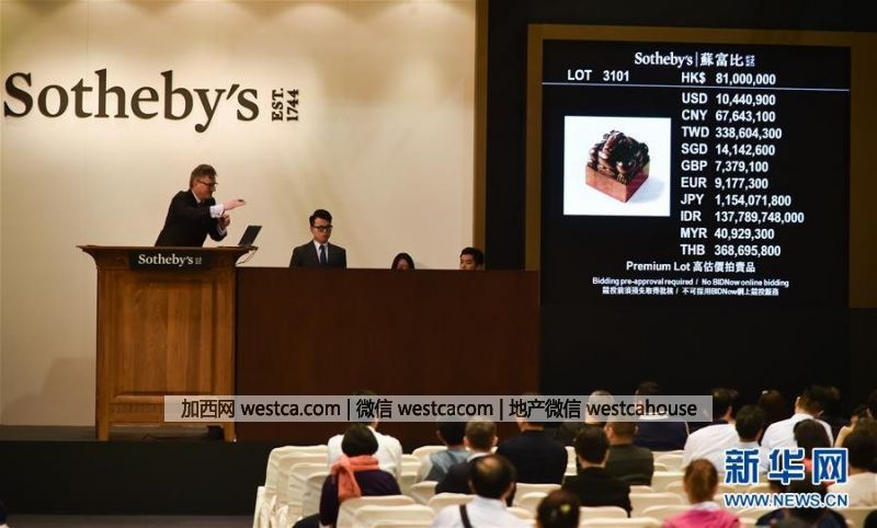 清康熙“敬天勤民”檀香木璽以8100萬港元成交現場。