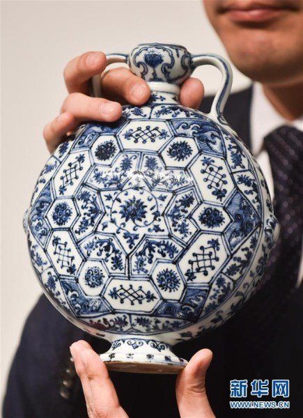 工作人員展示明永樂青花花卉錦紋如意耳扁壺。- 新聞來源於其它媒體,內容不代表本站立場!