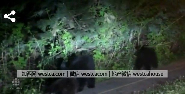 本周壹晚上,穆迪港(Port Moody)的居民Elle Brovold 就拍了兩只幼熊和壹只母熊在遺產山社區的森林公園道路上玩得正歡的畫面。