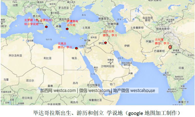 約公元前580年,愛琴海東岸有壹個叫薩摩斯的小島(從地圖上看,這個島和土耳其是如此的近,但它確實是希臘領土),古希臘偉大的數學家、哲學家、畢達哥拉斯學派創始人畢達哥拉斯就出生在這裡。他自幼好學,曾向古希臘著名哲學家阿那克西曼德(日晷與世界地圖的發明人)學習天文和幾何,向斐瑞居德(也譯作菲勒塞德斯,給出了叁個永生的原始神明:克羅諾斯“時間”、宙斯以及克托尼亞“大地”)學習自然科學知識。因為向往東方的智慧,經過萬水千山,游歷了古巴比倫和古埃及,據說也可能到過古印度。在今天的地圖上,他走了下面圖例中(示意圖)中的地方,我們無法知道畢達哥拉斯是否真的到過印度(古印度可能包括了印度河、恒河流域的壹些國家,如印度、巴基斯坦、孟加拉國、尼泊爾、不丹、錫金),但在他的身上,行萬裡路,讀萬卷書,真是有過之而無不及!