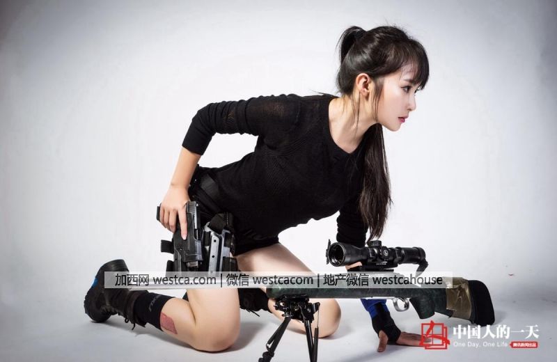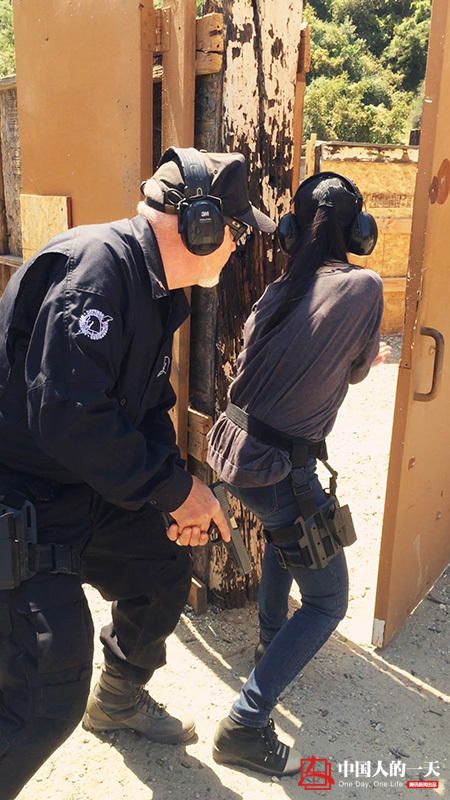 LIYIYI 第壹次體驗射擊的時候使用的是機關槍,靶紙成績創下了那家室內靶場的新手最高紀錄。她認為這壹次的成績很可能是偶然,於是找到了全洛杉磯最大最專業的槍械戰術訓練公司,希望由最專業的人士來判斷她到底是否有天賦。圖為LIYIYI第壹次參加槍械戰術射擊訓練,他們正准備沖進壹個房間解救人質。那時候她剛到美國叁個月,還沒來得及買運動鞋,穿著內增高鞋參與訓練的照片引來了很多人的嘲笑。