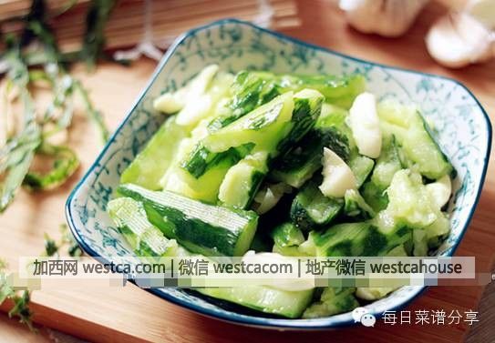 黄瓜 1根、蒜 2瓣、食盐 1/3茶匙、白糖 1/2茶匙、米醋 1茶匙、芝麻油 少许