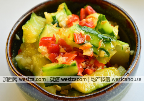 3.酱爆好的蒜蓉油倒入黄瓜碗里,拌匀即可