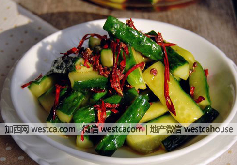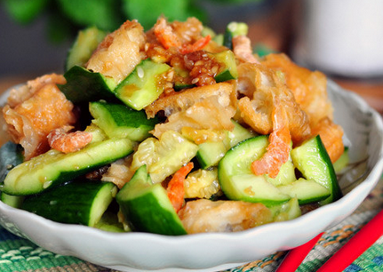 1.黄瓜洗净,切条,用盐拌匀,腌制半小时,控干杀出的水分