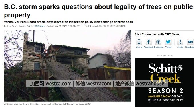 大溫地區近年發生樹木倒塌壓壞屋頂的新聞也頻頻見報,最嚴重的要數今年3月發生的樹木倒塌,造成Port Moody女居民Jill Calder在自家床上被壓死的事故。