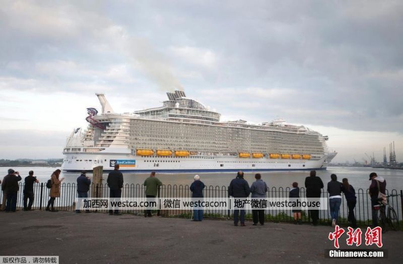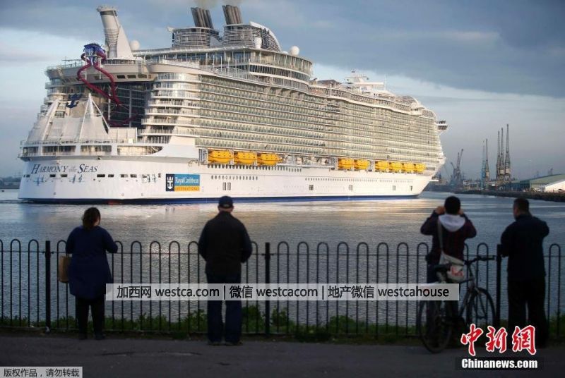 南安普敦當地民眾圍觀這艘巨大的郵輪。海洋和諧號游輪全長361米,比法國埃菲爾鐵塔還要長出約50米;寬約66米,是迄今為止最寬的游輪。比歷史上著名的“泰坦尼克號”還要長100米。