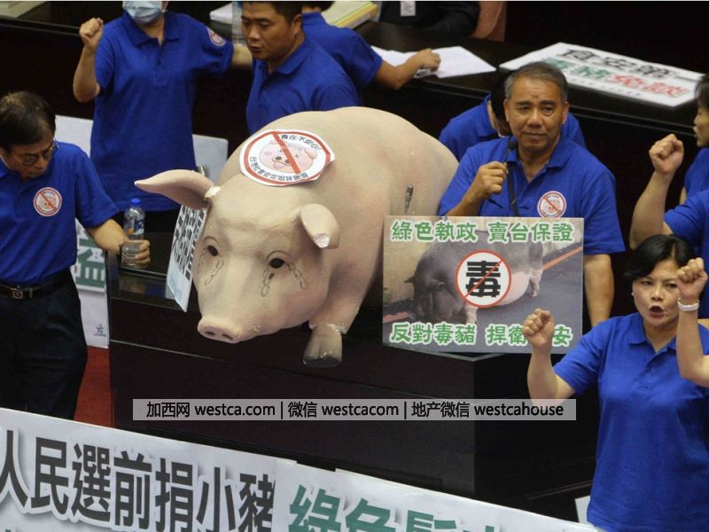 國民黨團今天杯葛台灣行政院長林全施政方針報告,立法院外上午聚集養豬戶高舉牌抗議拒絕進口美國瘦肉精豬肉,立法院內國民黨立委以假豬霸占發言台以示抗議,並要求台行政院長林全要簽署同意書,才能進行施政報告。