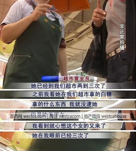 超 市營業員:她在我家稱的鴨腿,然後這邊來拿的小米,她已經在前面拿過桃酥、現在拿的這個米,兩種,桃酥已經放到這邊了,我就在櫃台,我就看著她走了。她已 經到我們超市兩到叁次了,之前我看她在我們超市拿的白糖,拿的什麼東西,我就沒逮她,但是前天下午,我看到就心想這個女的又來了。她在我眼前已經叁次了。