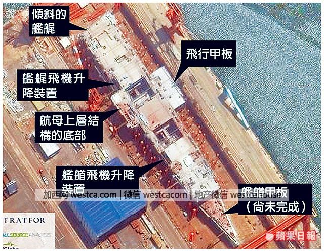 中国一向把自制航空母舰视为重要目标,既可宣扬中国海军实力,亦可在海外运补发挥战略性作用。最新曝光的卫星照片显示,中国自制航母还在铺设甲板,离服役还须一段时日。美国智库「战略预测公司」(Stratfor)上周公开一张卫星空拍图,显示中国首艘自制航母001A在大连船坞施工情形。Stratfor指出,不同部位的船体分开打造再组合可加速施工速度,估计最快2017年下水,但要正式组成舰队服役,还要好几年。