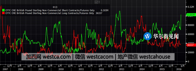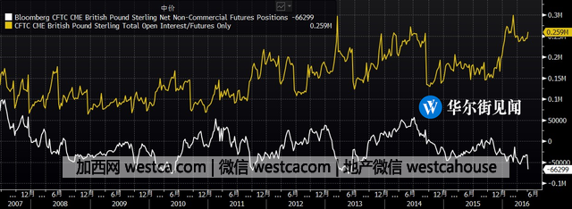 本周投機者們大舉加倉做空英鎊,導致英鎊的淨空頭翻倍,創下近伍年來最大單周增幅。顯示還有兩周即將面臨英國退歐公投,盡管結果還不明朗,但市場對該國貨幣已然采取“絕對防守”的措施。