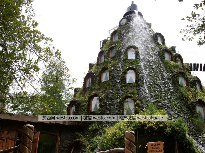 智利的Huilo Huilo是属于私人拥有的自然保护区,这里有座智利最好的酒店之一:魔术山旅馆。这是座看起来如同火山般的建筑,只不过在这山顶喷涌而出的不再是炽热熔岩、而是清凉的瀑布,但是,如果你对真火山感兴趣,也可以在这里远望到壮观的阿雷纳火山。酒店唯一的通道是与树顶齐高的人工吊桥,行走其中能享受漫步于树端的奇妙。内部13间客房都配有独立大型浴室,躺在浴缸享受独特的树干水管提供温暖热水的同时,旅客还可以透过大窗户俯瞰雄伟的热带雨林风景,甚至于巨嘴鸟、蜥蜴、鬣蜥、雄鹰、秃鹫和美洲狮等动物也尽收眼底。