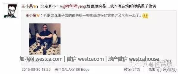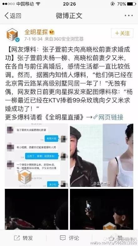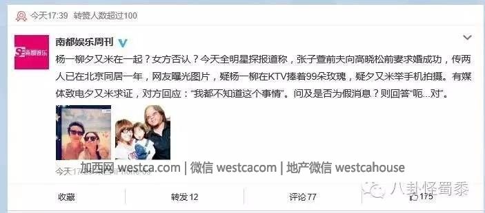 然後今天全明星探爆出了個新聞,說是張子萱的我前夫楊壹柳向高曉松的前妻夕又米求婚成功,而且兩人已經同居了壹年多了。兩人被拍到壹起吃飯回家秀恩愛。