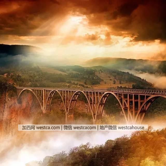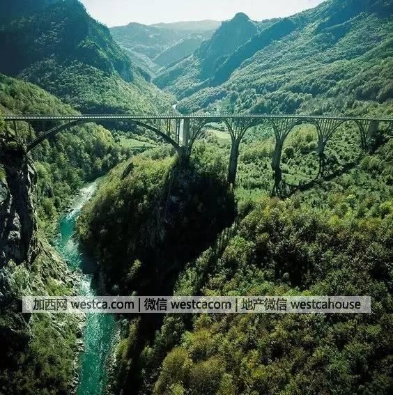 黑山的塔拉河谷大橋橫跨歐洲最深的塔拉河大峽谷,日出時,陽光將整個山谷染成金色,風景宜人。
