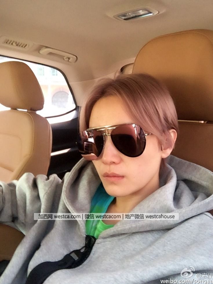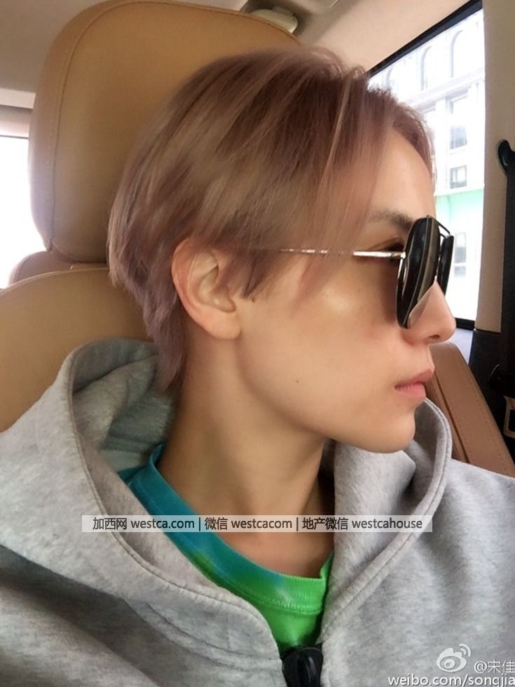 照片中,宋佳將壹頭長發剪成了短發並染成了灰粉色,她帶著壹副太陽鏡穿著甩帽衫表情很酷。