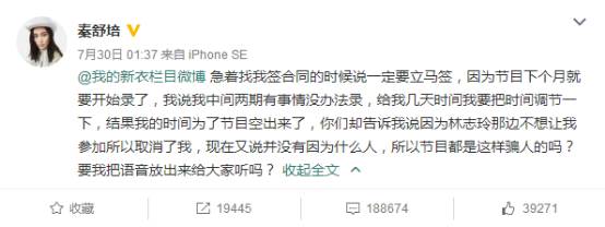 雖然林志玲的經紀人和片方都否認,可秦舒培卻在微博發文並曬截圖,稱節目組在騙人,表示,是因為林志玲不想自己參加,所以節目組炒了自己,還有錄音為證。